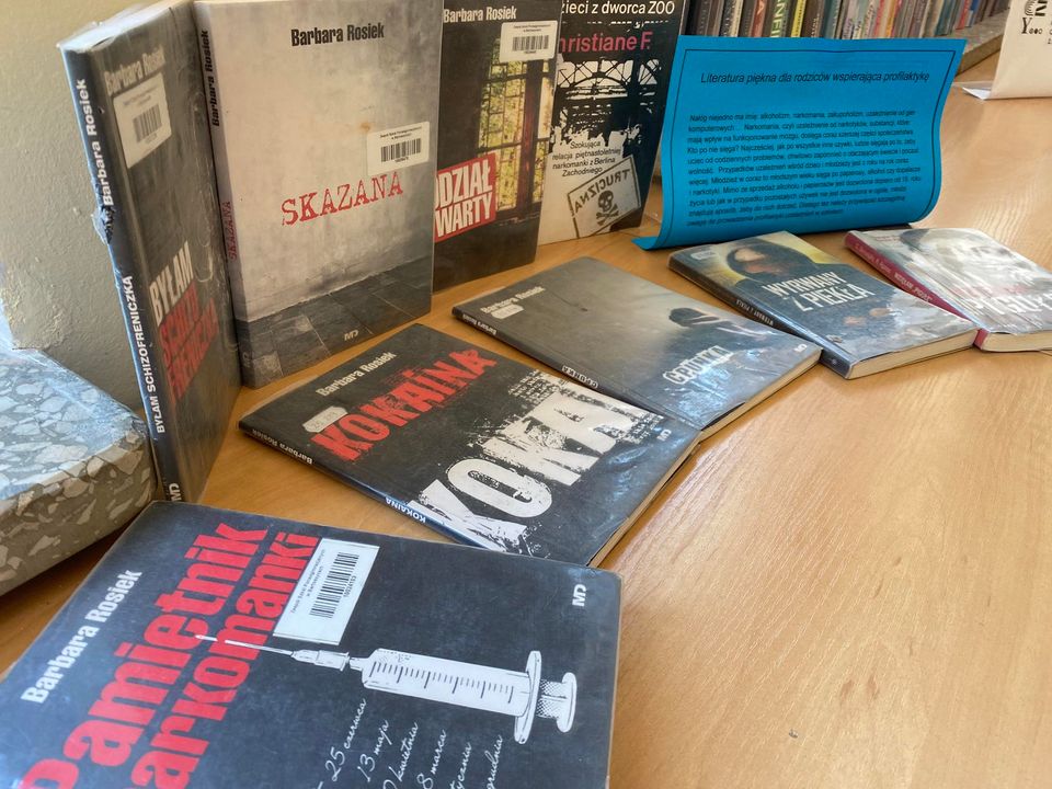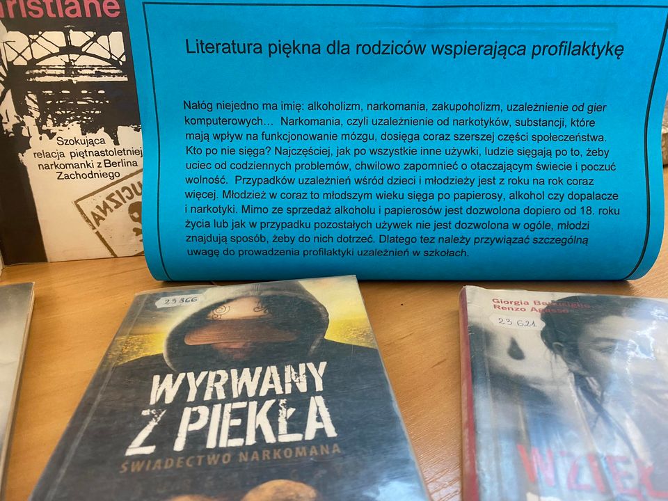 Serdecznie zapraszamy rodziców, opiekunów do naszej biblioteki po literaturę na temat uzależnień nastolatków. Każdy rodzic chce dla swojego dziecka jak najlepiej. Z obawy o jego zdrowie i szczęście dorośli często nie zauważają lub nieświadomie negują pierwsze sygnały świadczące o tym, że dziecko ma problem z uzależnieniem. Poza zmianą zachowania, nałóg powoduje także zmiany fizyczne. Nastolatek może chudnąć, mieć czerwone oczy, może mieć krwotoki z nosa i drżące dłonie. Takie sygnały mogą, ale oczywiście nie muszą, świadczyć o tym, że dziecko może nadużywać leków, narkotyków lub alkoholu. Każdy rodzic dobrze zna swoje dziecko. Wie jakie są jego zainteresowania, zna przynajmniej kilku jego znajomych. Tak naprawdę im większe zaangażowanie rodzica/opiekuna w życie dziecka, tym łatwiej jest zauważyć pierwsze objawy uzależnienia. Zapraszamy!