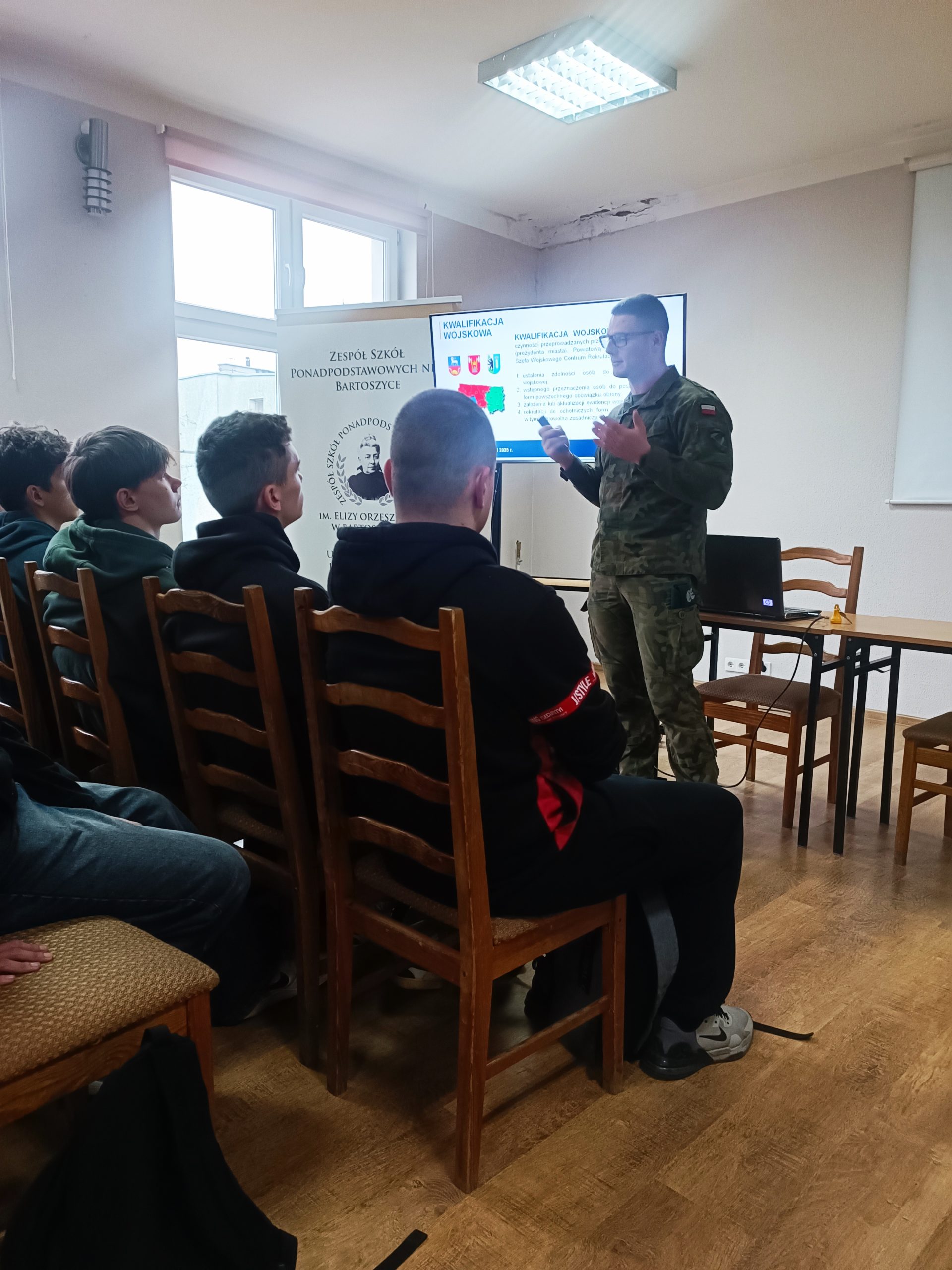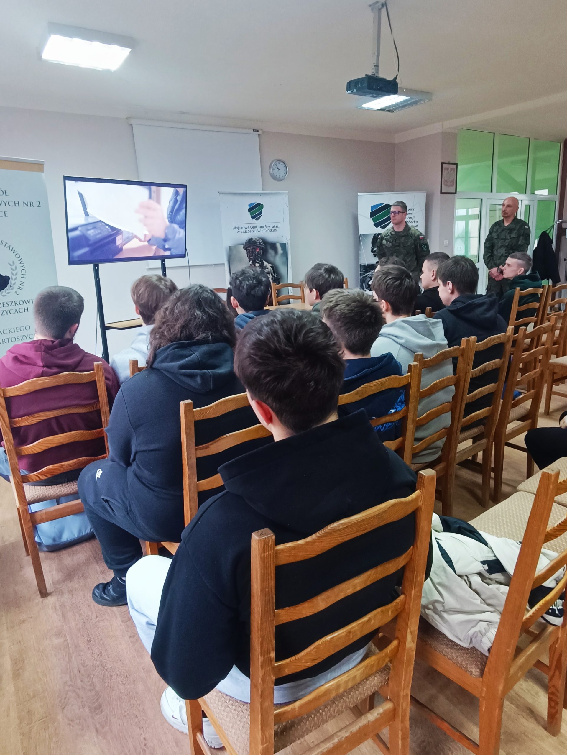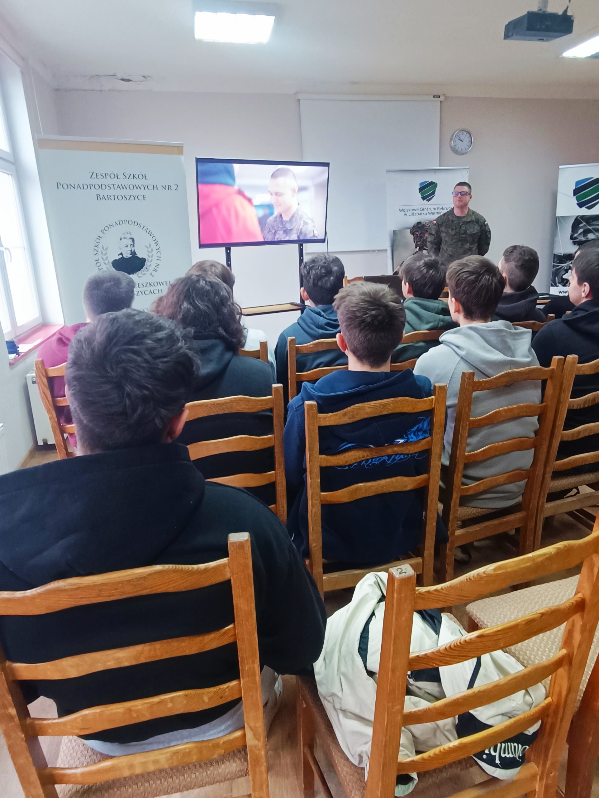 W lutym rusza coroczna obowiązkowa kwalifikacja wojskowa. Tym razem muszą do niej przystąpić mężczyźni urodzeni w 2006 roku. To głównie uczniowie klas czwartych liceum i technikum, dlatego z wizytą do naszej szkoły przybył st. szer. spec. Piotr Myślewski i kpr. Dariusz Szarek z Wojskowego Centrum Rekrutacji w Lidzbarku Warmińskim. Chłopcy poznali szczegóły dotyczące kwalifikacji, a więc jak wygląda cały proces krok po kroku oraz jak i na co trzeba się przygotować. Dowiedzieli się jakie dokumenty należy ze sobą wziąć, a także żeby pilnować terminu i godziny, po to by wszystko przebiegło sprawnie i na czas.