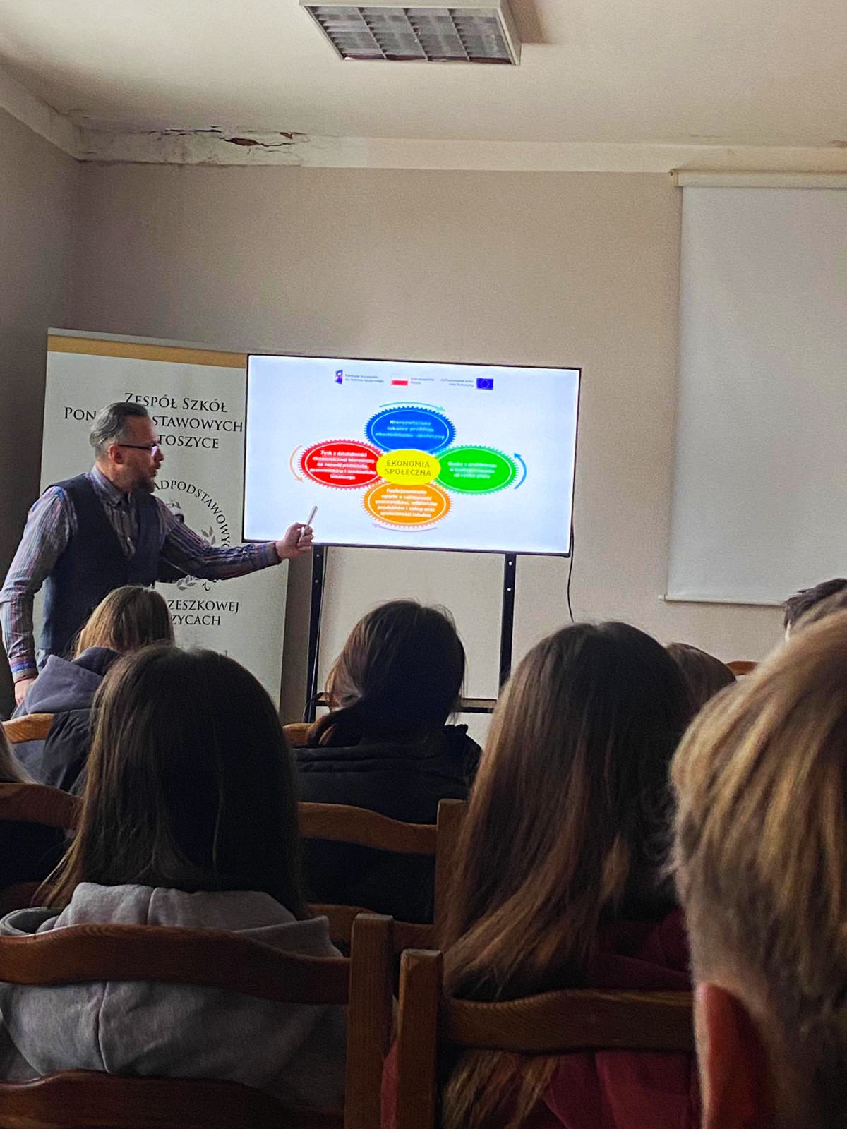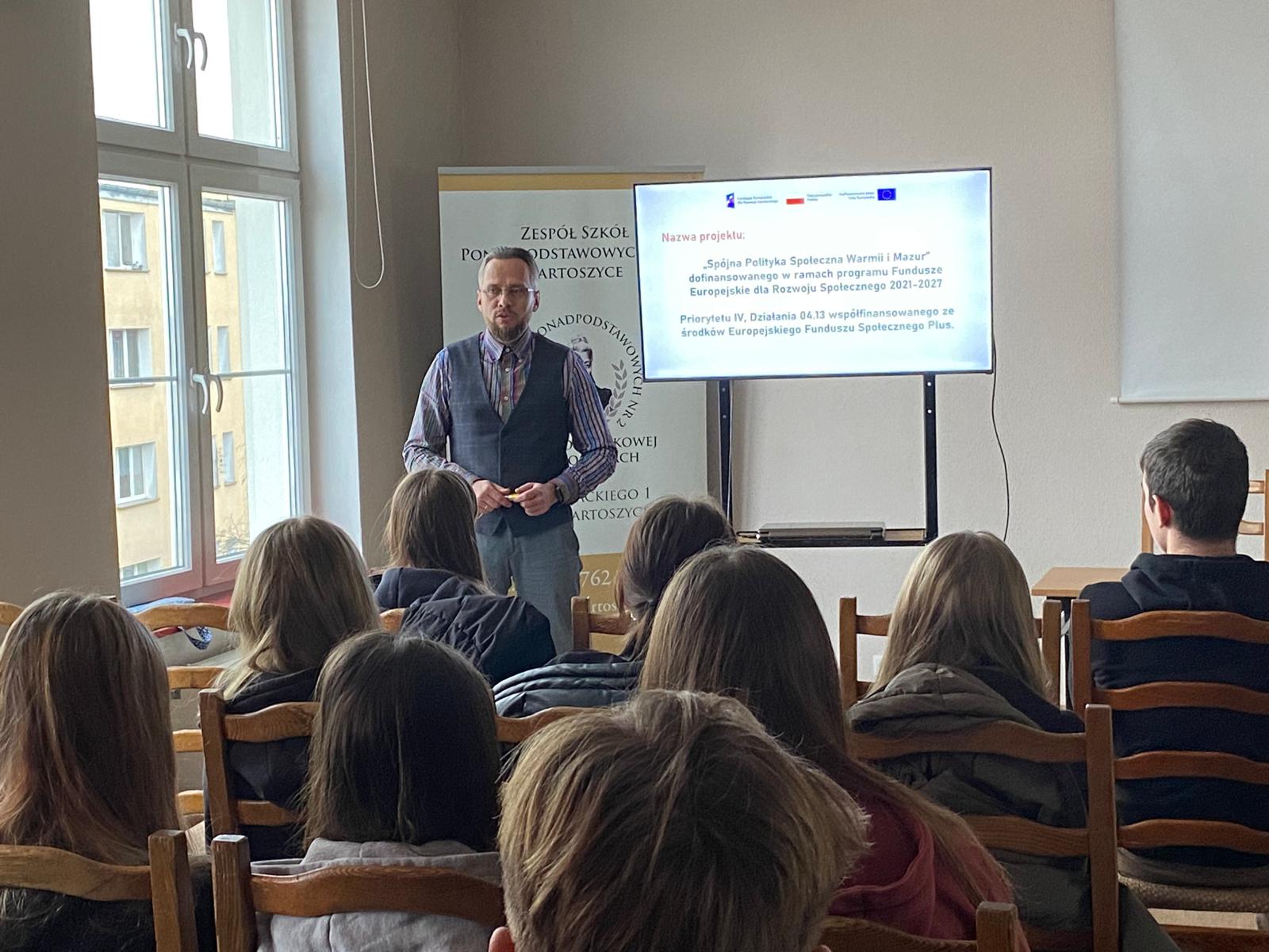 Uczniowie klas 2 A LO i 2 TE brali udział w projekcie „Spójna Polityka Społeczna Warmii i Mazur”, którego celem jest popularyzacja ekonomii społecznej, w tym działalności przedsiębiorstw społecznych. Każda z klas uczestniczyła w dwóch spotkaniach, gdzie pierwsze zajęcia składały się z części teoretycznej, a drugie z praktycznej z wykorzystaniem edukacyjnej gry planszowej z zakresu ekonomii społecznej. Spotkania prowadził Pan Marek Orlicki, specjalista ds. przedsiębiorczości. Uwzględniały one: