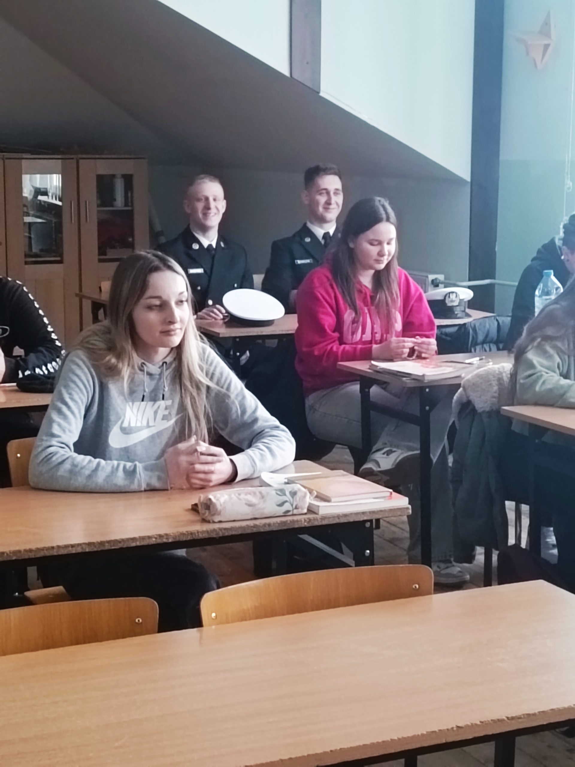 Absolwenci przybyli do nas w Walentynki, zatem zaprosiliśmy ich do wylosowania walentynkowej wróżby i skosztowania naszego słodkiego poczęstunku. Podchorąży skorzystali też z okazji, by przypomnieć sobie jak to było siedzieć w szkolnych ławach oraz odwiedzili Panią Dyrektor.