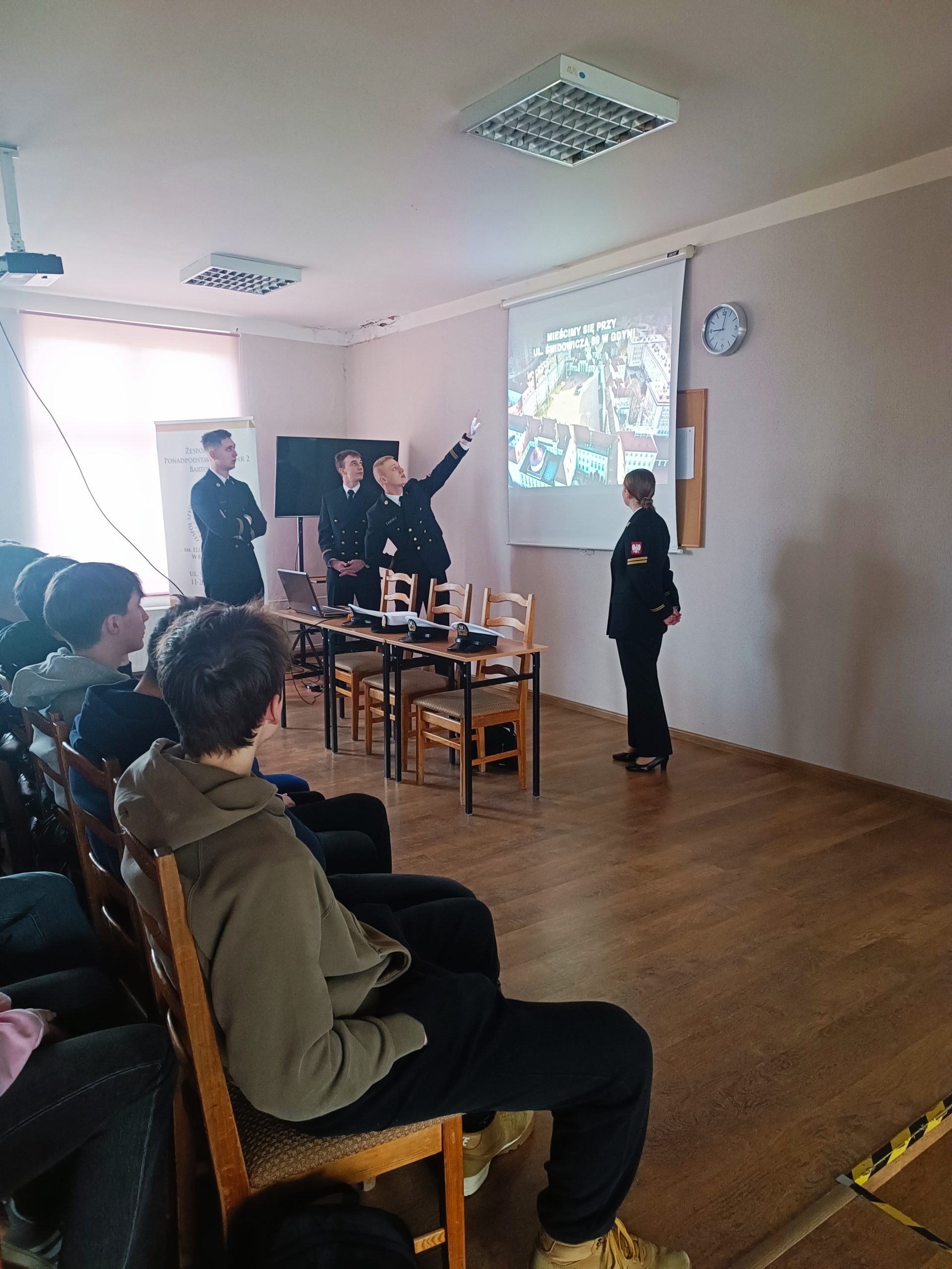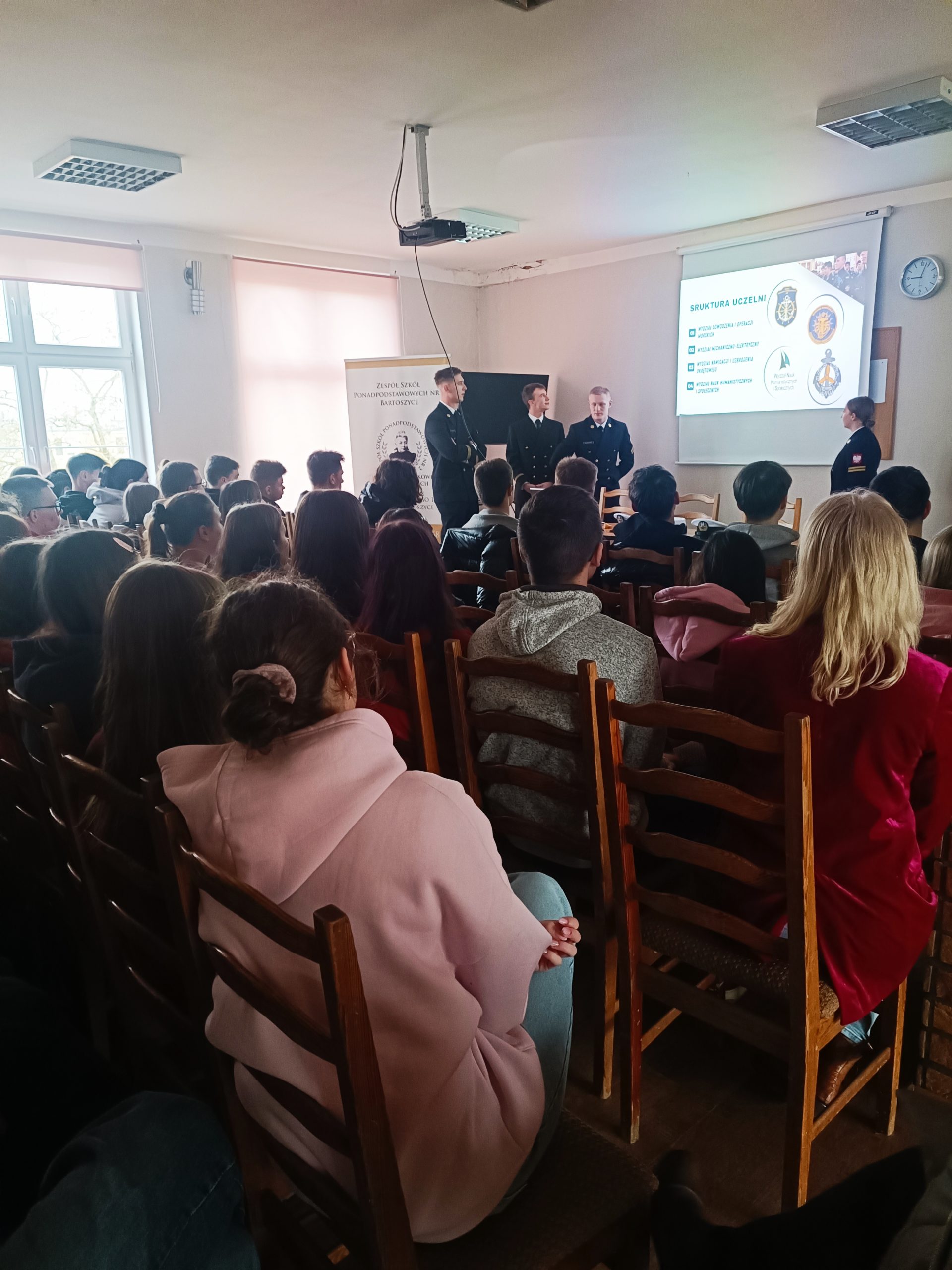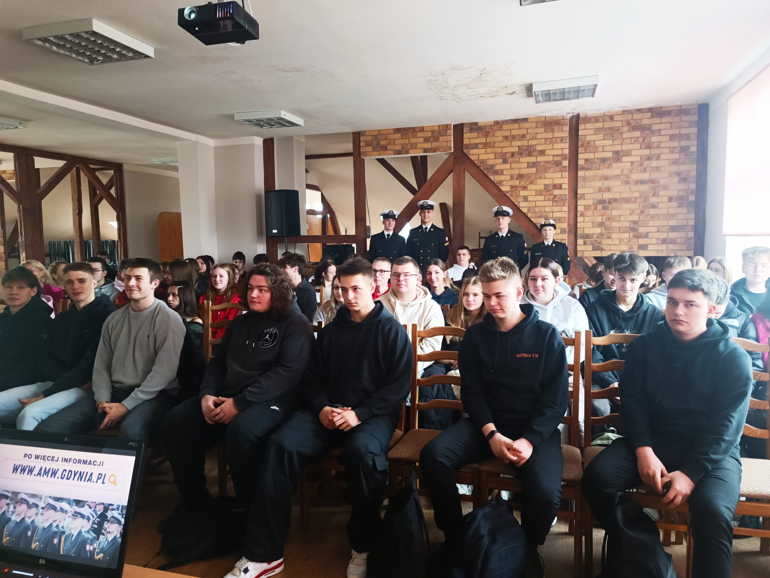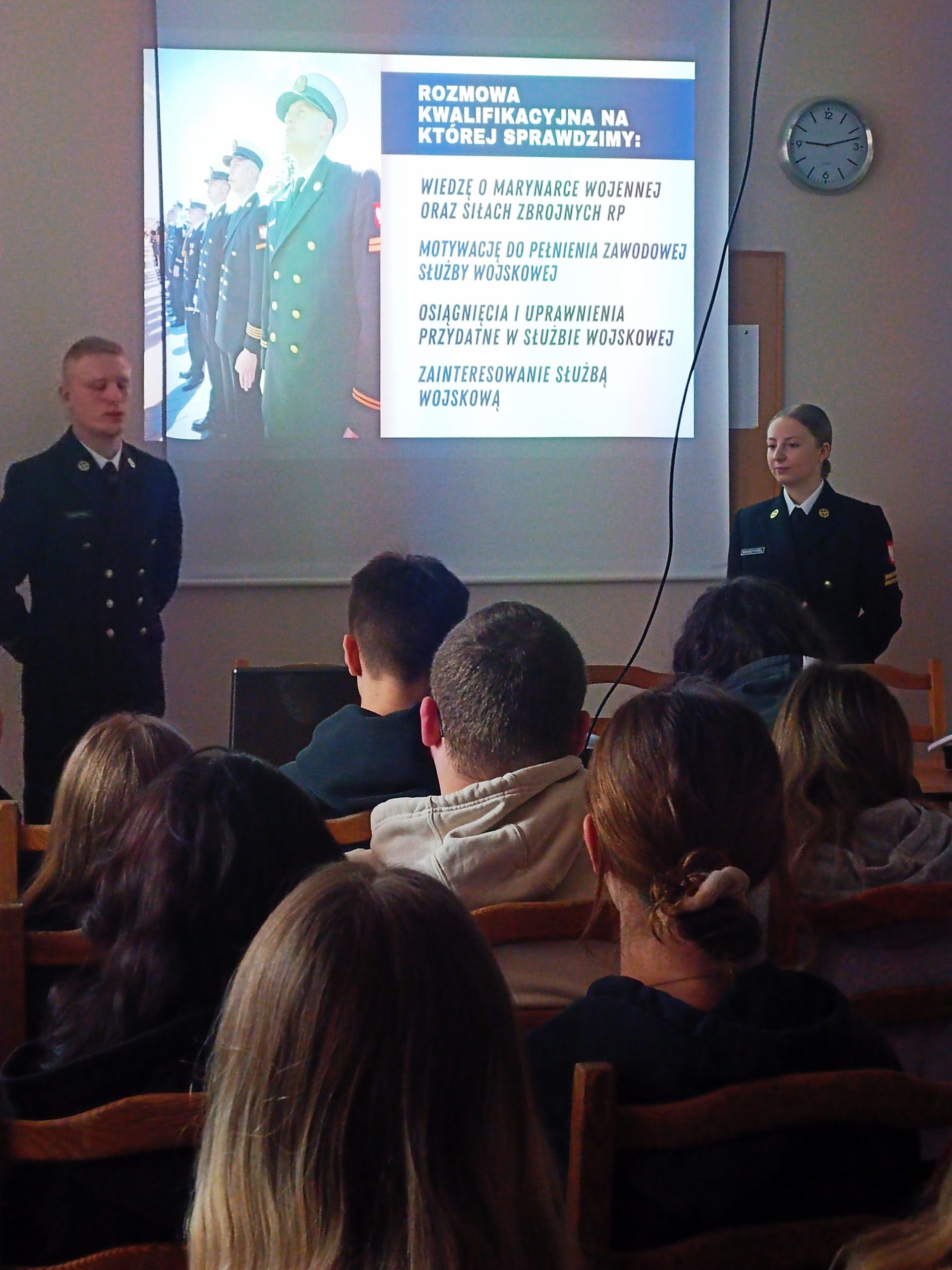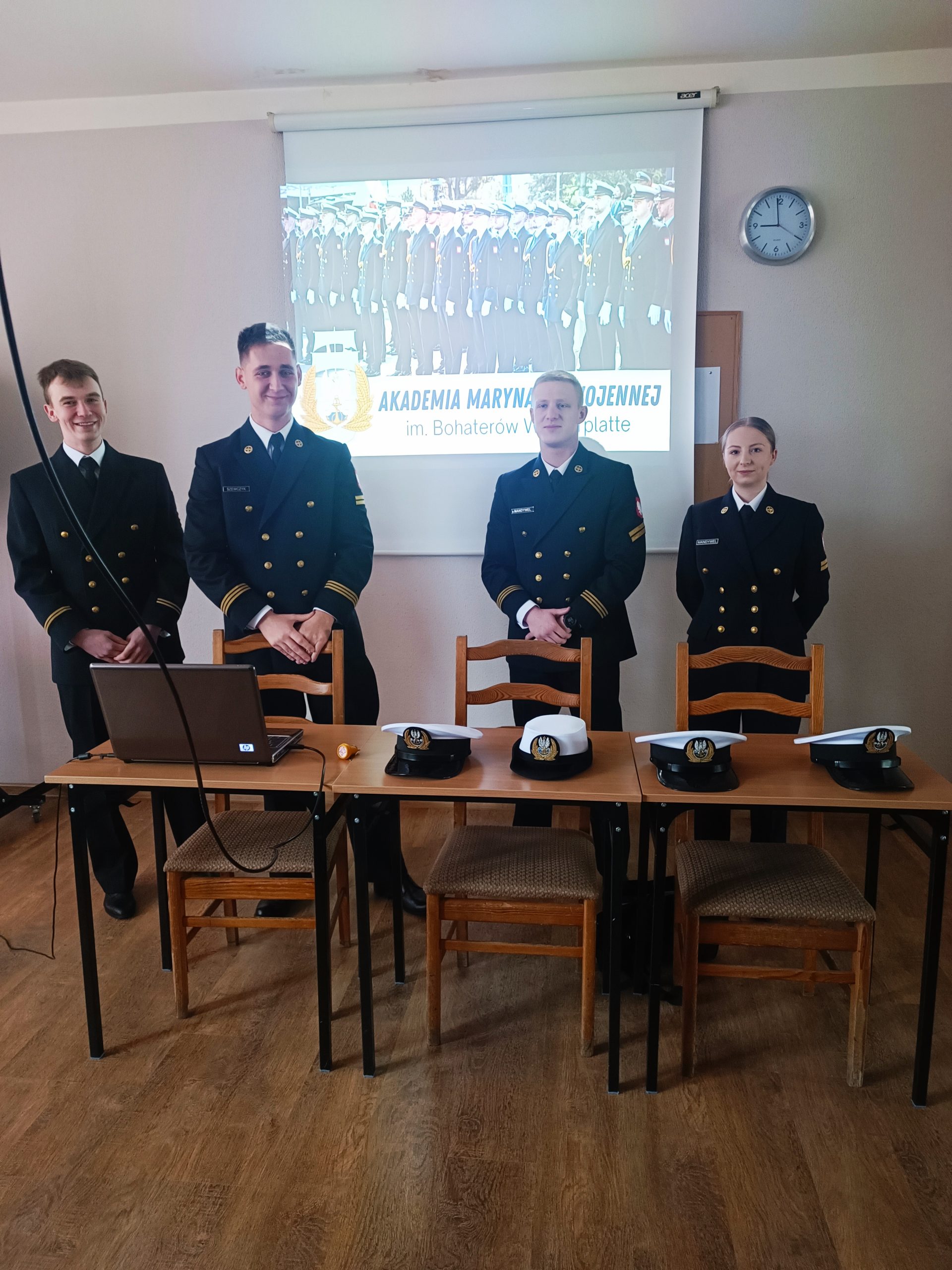 Żołd, zakwaterowanie i wyżywienie – to jedne z głównych atutów studiowania na uczelniach wojskowych. 14 lutego mieliśmy przyjemność gościć podchorążych Akademii Marynarki Wojennej im. Bohaterów Westerplatte w Gdyni, którzy są absolwentami bartoszyckich szkół, w tym naszej „Elizki”. Rodzeństwo Weronika i Mateusz Mandywel, Maciej Szewczyk oraz Filip Tokarz opowiedzieli o swojej nauce na kierunkach: cyberbezpieczeństwo, mechatronika, logistyka i nawigacja by zachęcić młodzież stojącą przed wyborem dalszej drogi, do wstąpienia w szeregi Akademii. Uczniowie poznali zasady rekrutacji i warunki przyjęcia na studia oraz benefity jakie przysługują studentom podczas kształcenia. Dowiedzieli się też jak wygląda dzień podchorążego na uczelni.