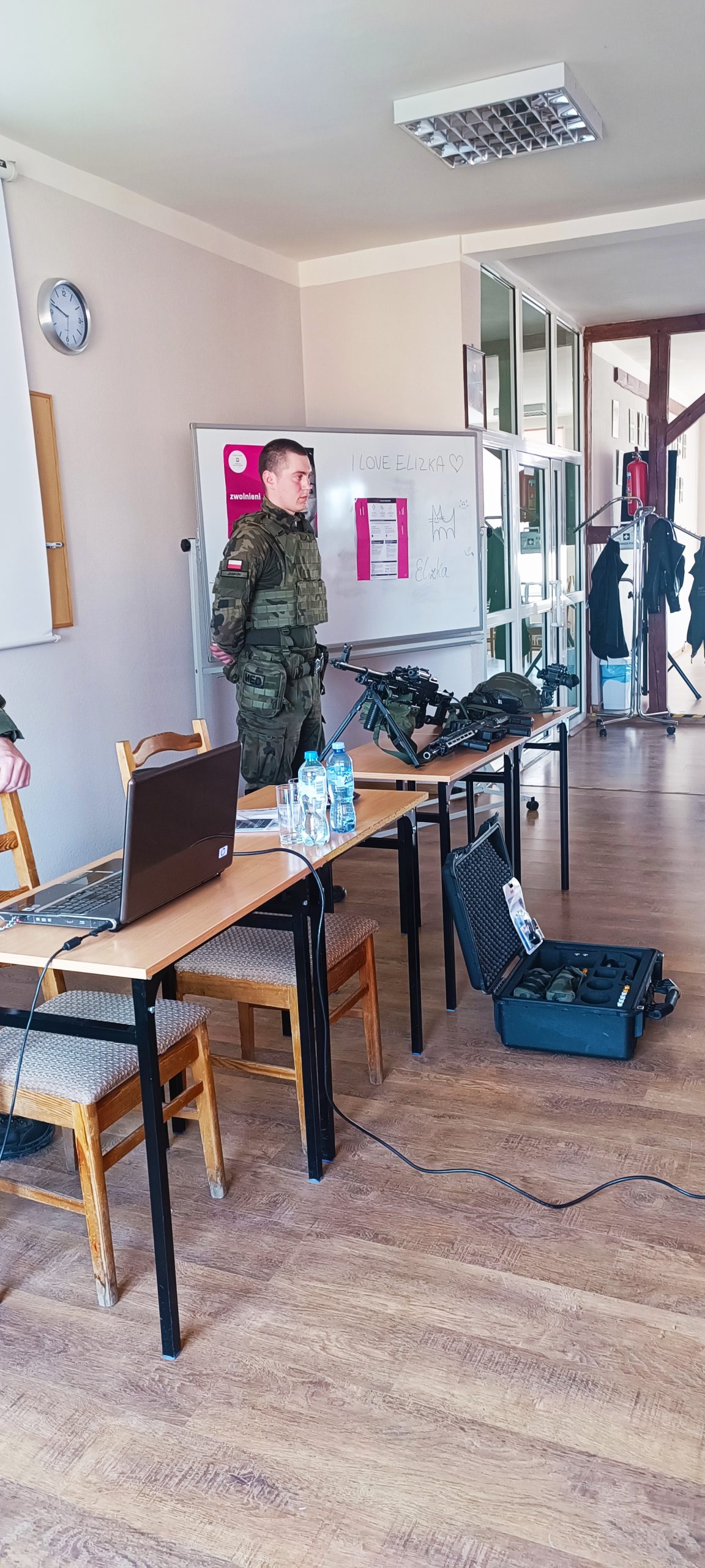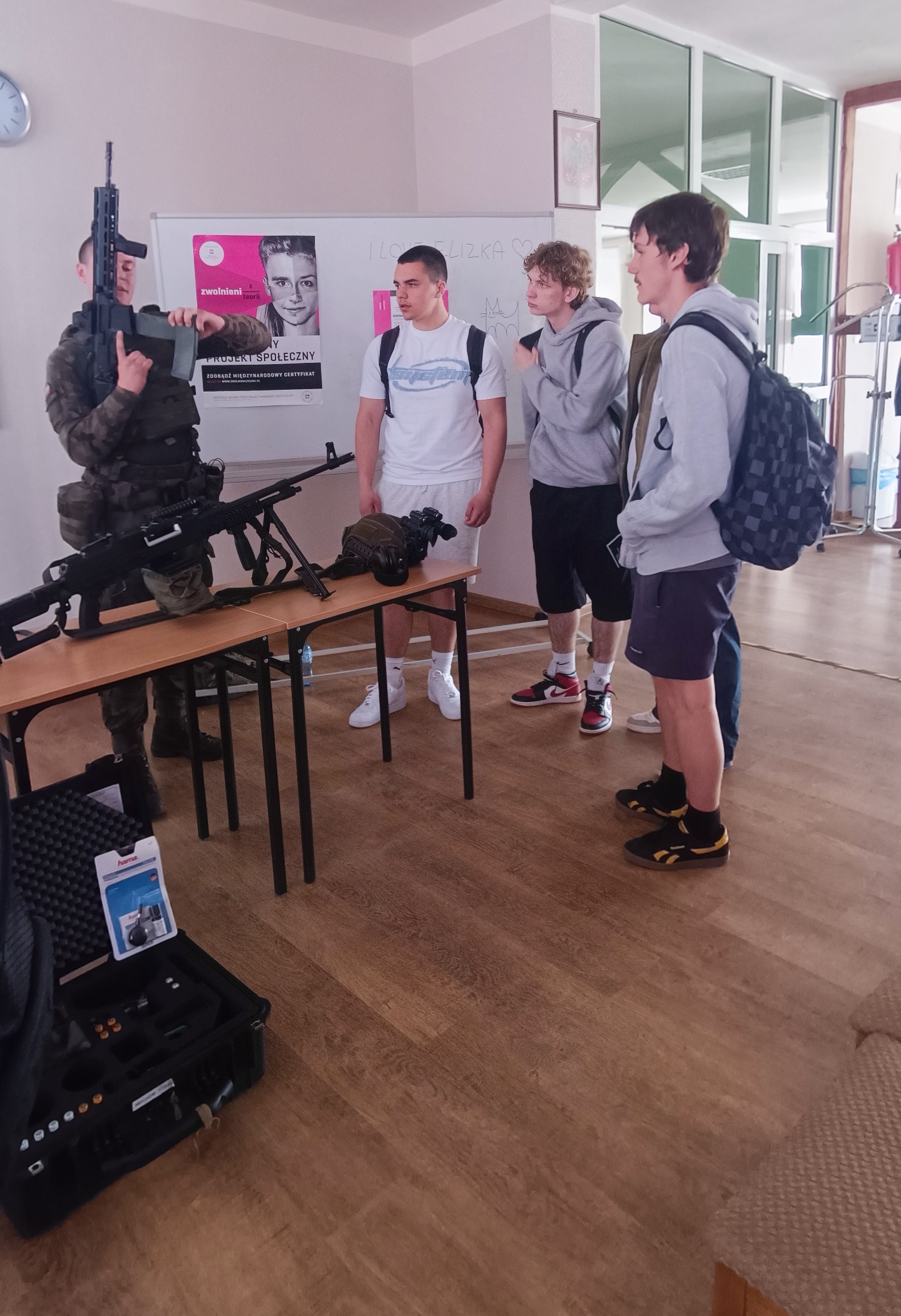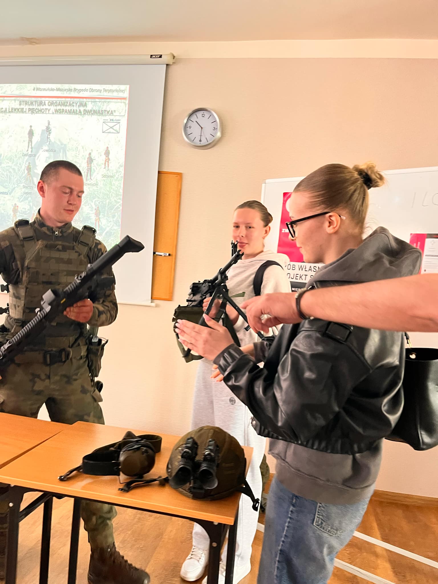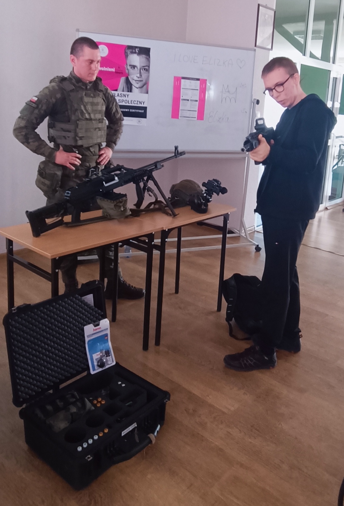 Sprzęt jakim dysponuje Wojsko Obrony Terytorialnej wzbudził duże zainteresowanie wśród młodzieży „Elizki”. Ze swoim wyposażeniem do szkoły przyjechali żołnierze 43 Batalionu Lekkiej Piechoty w Braniewie. Por. Mateusz Gagjew oraz szer. Dawid Jankun udzielili szczegółowych informacji dotyczących tego jak dostać się do WOT i jak wyglądają szkolenia. Powiedzieli o korzyściach i obowiązkach wynikających ze wstąpienia w szeregi „terytorialsów”. Na koniec uczniowie mogli podejść i osobiście przymierzyć się do broni prezentowanej na naszym spotkaniu.