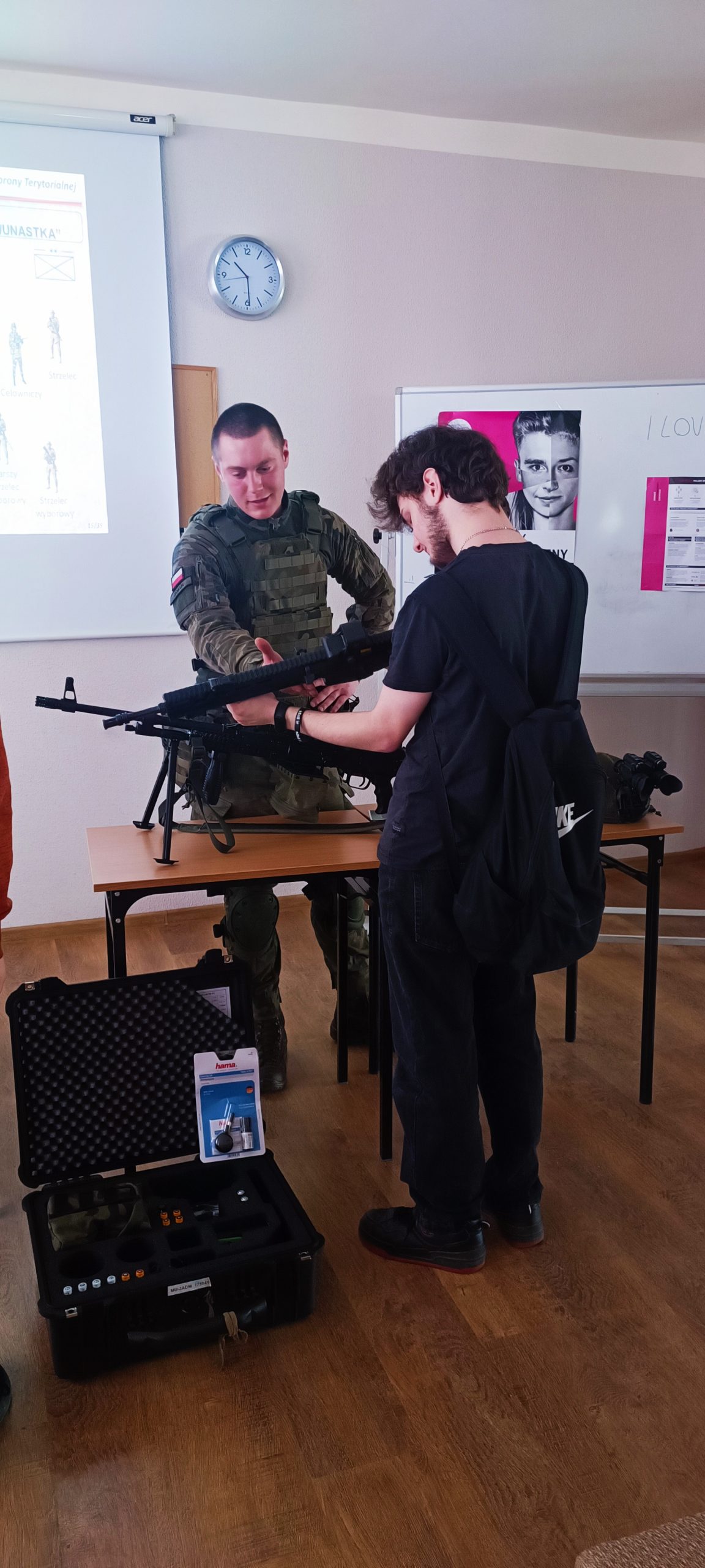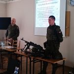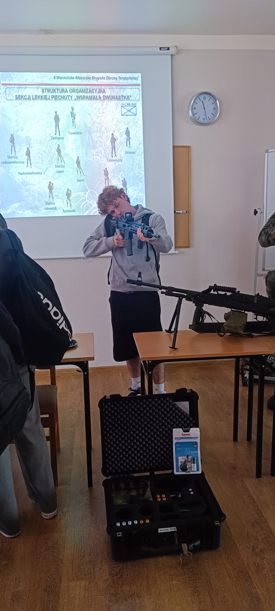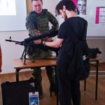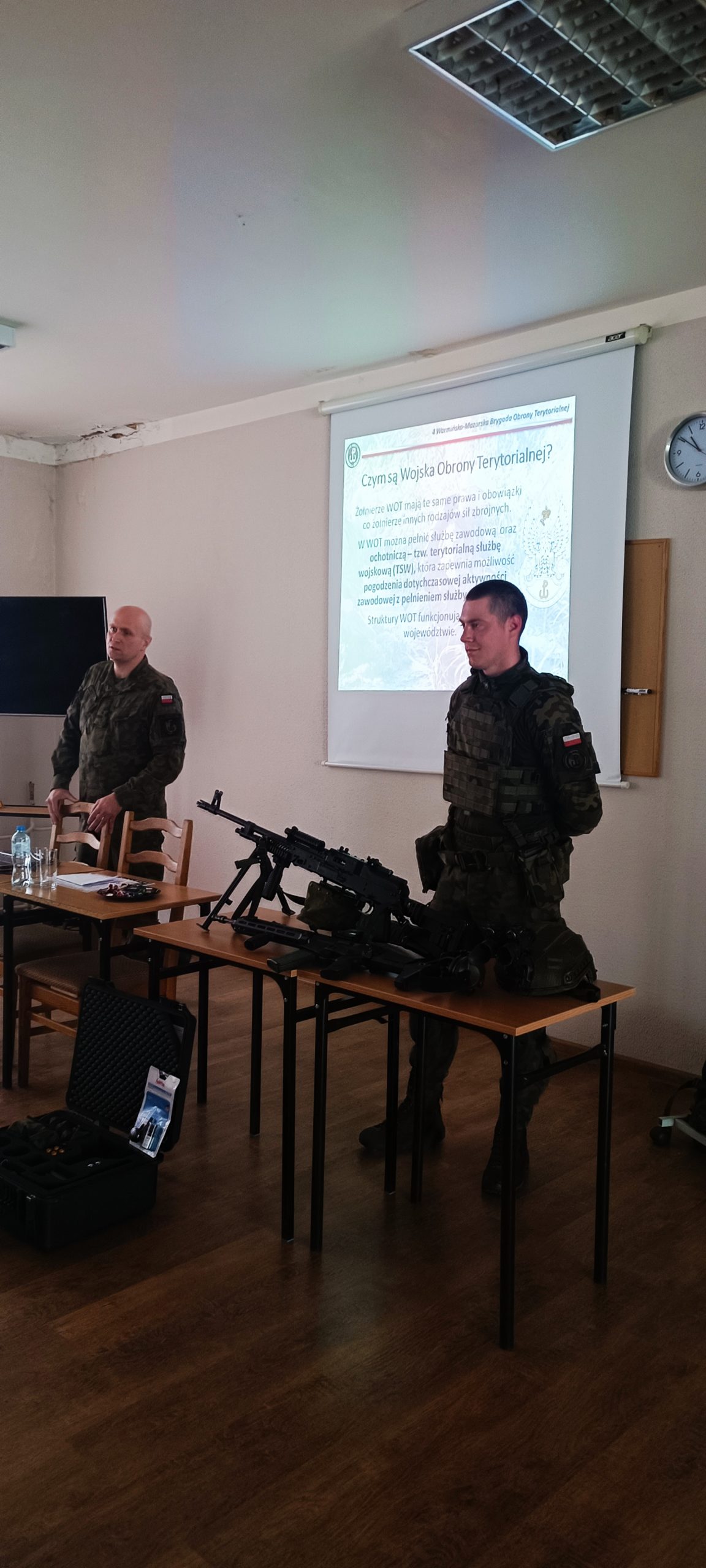 Sprzęt jakim dysponuje Wojsko Obrony Terytorialnej wzbudził duże zainteresowanie wśród młodzieży „Elizki”. Ze swoim wyposażeniem do szkoły przyjechali żołnierze 43 Batalionu Lekkiej Piechoty w Braniewie. Por. Mateusz Gagjew oraz szer. Dawid Jankun udzielili szczegółowych informacji dotyczących tego jak dostać się do WOT i jak wyglądają szkolenia. Powiedzieli o korzyściach i obowiązkach wynikających ze wstąpienia w szeregi „terytorialsów”. Na koniec uczniowie mogli podejść i osobiście przymierzyć się do broni prezentowanej na naszym spotkaniu.