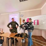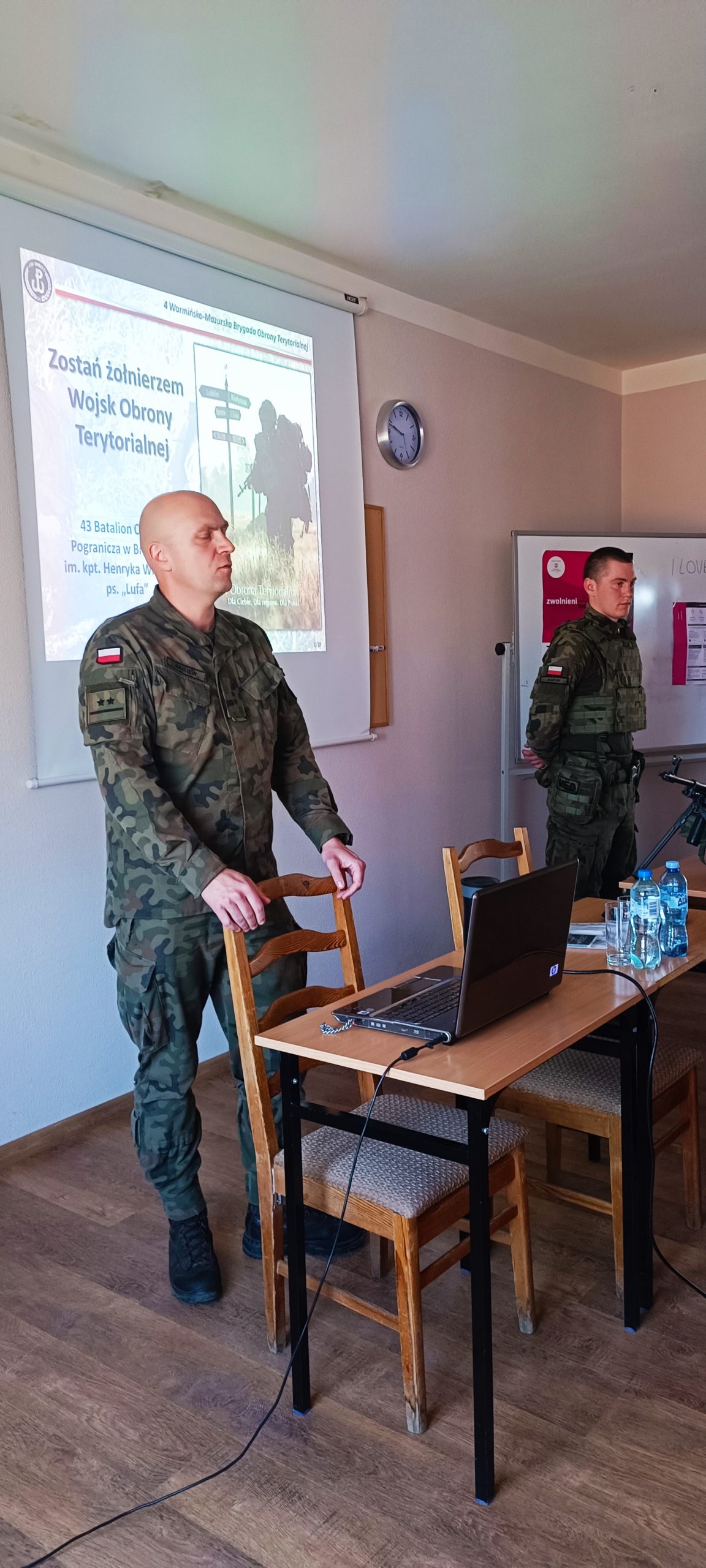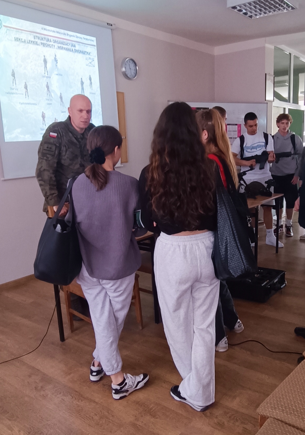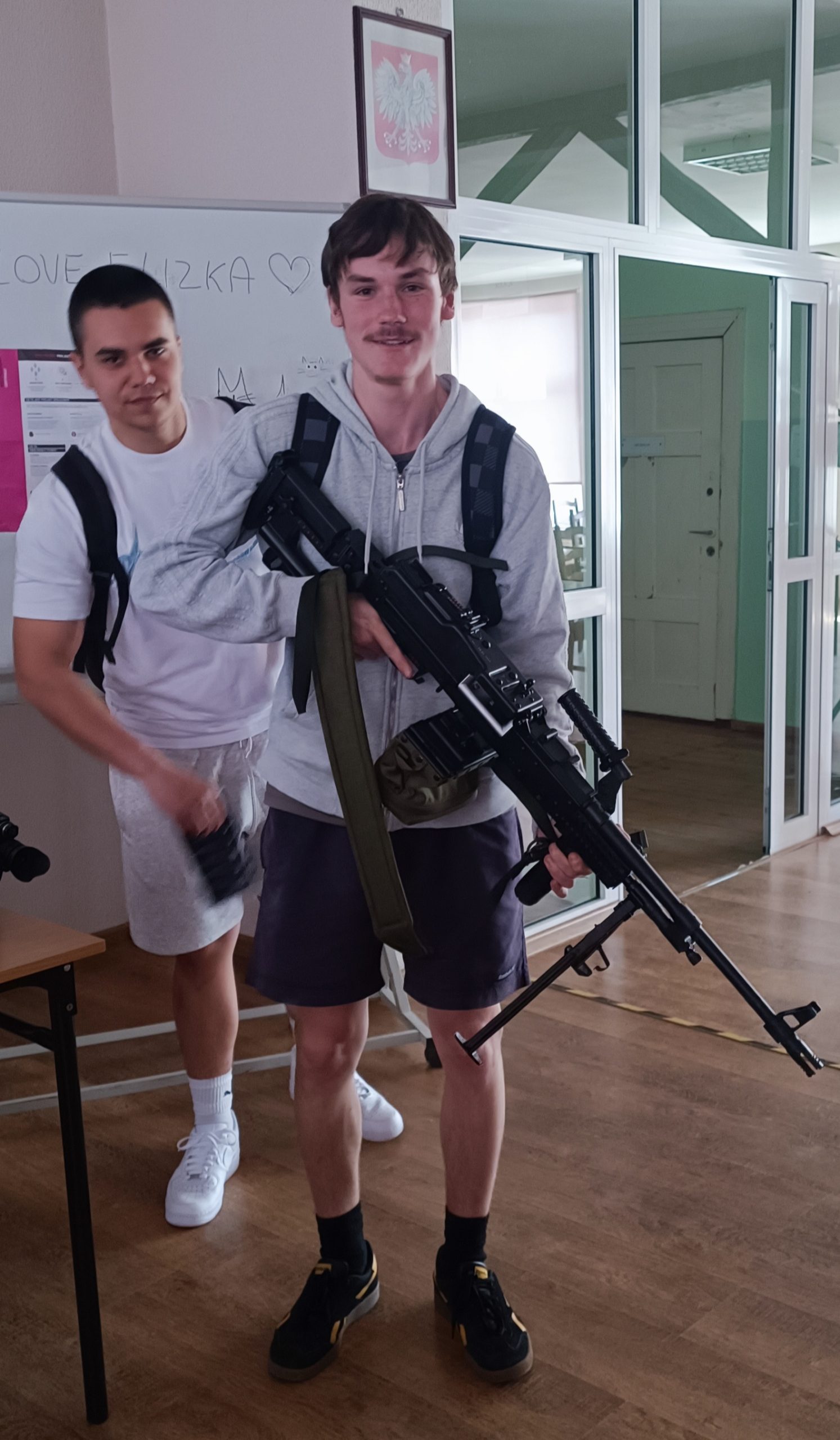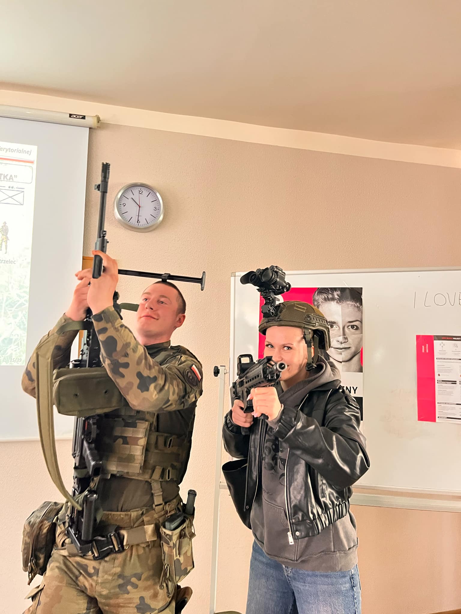 Sprzęt jakim dysponuje Wojsko Obrony Terytorialnej wzbudził duże zainteresowanie wśród młodzieży „Elizki”. Ze swoim wyposażeniem do szkoły przyjechali żołnierze 43 Batalionu Lekkiej Piechoty w Braniewie. Por. Mateusz Gagjew oraz szer. Dawid Jankun udzielili szczegółowych informacji dotyczących tego jak dostać się do WOT i jak wyglądają szkolenia. Powiedzieli o korzyściach i obowiązkach wynikających ze wstąpienia w szeregi „terytorialsów”. Na koniec uczniowie mogli podejść i osobiście przymierzyć się do broni prezentowanej na naszym spotkaniu.