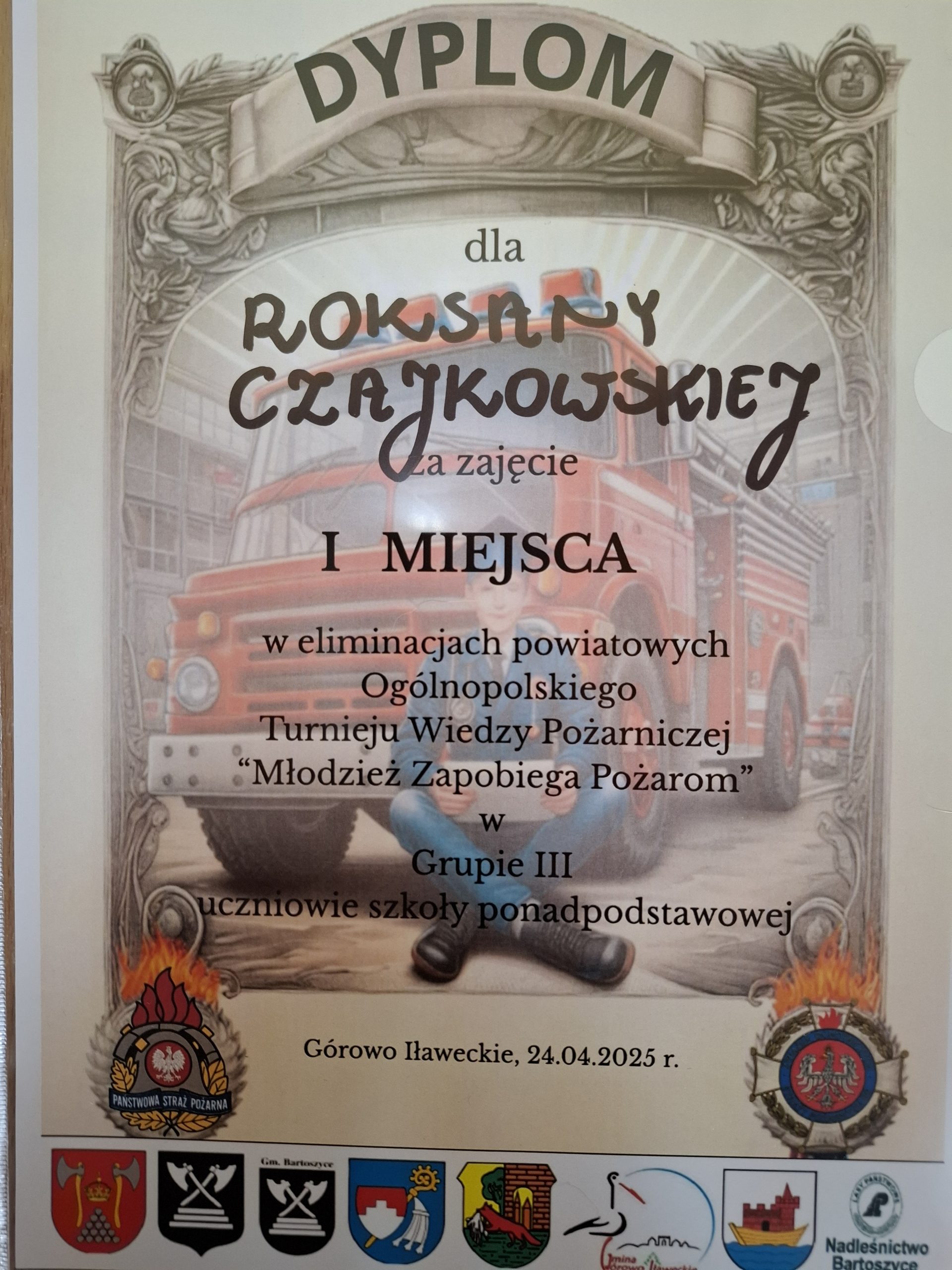 Uczennica naszej szkoły Roksana Czajkowska zdobyła I miejsce w grupie szkół ponadpodstawowych w eliminacjach powiatowych Ogólnopolskiego Turnieju Wiedzy Pożarniczej ,,Młodzież zapobiega pożarom” i zakwalifikowała do etapu wojewódzkiego.