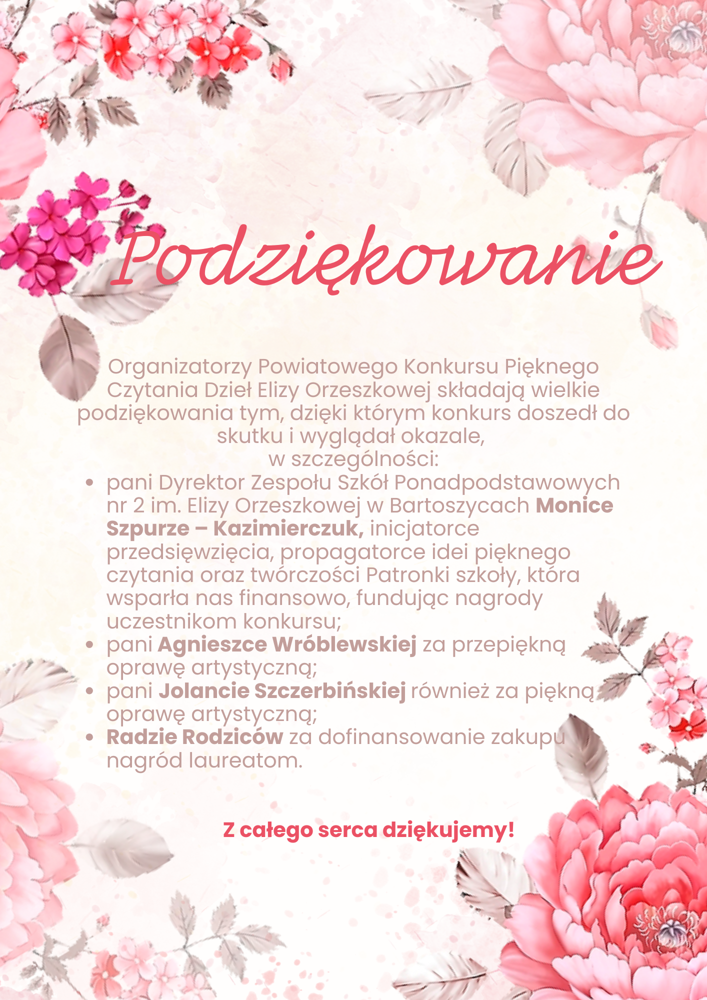 23 czerwca 2025 r. w Zespole Szkół Ponadpodstawowych nr 2 im. Elizy Orzeszkowej w Bartoszycach odbył się Powiatowy Konkurs Pięknego Czytania Dzieł Elizy Orzeszkowej, w którym wzięło udział 17 uczniów szkół średnich naszego powiatu. Konkurs był wspólną inicjatywą Zespołu Szkół Ponadpodstawowych nr 2 oraz Ośrodka Doskonalenia Nauczycieli w Bartoszycach.